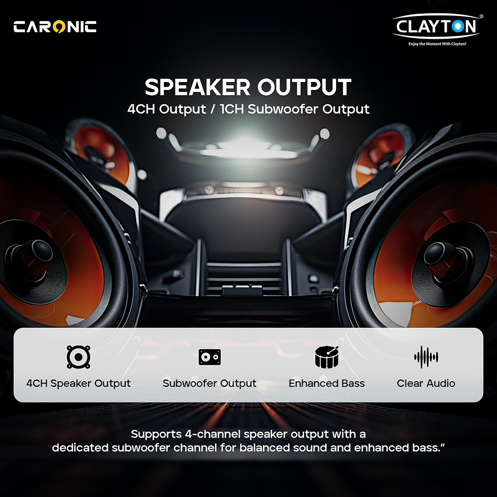 Experience powerful, immersive sound with advanced 4-channel speaker output and a dedicated subwoofer channel. This system delivers balanced audio, enhanced bass, and crystal-clear sound across all frequencies. Enjoy richer music, clearer vocals, and deeper lows that transform every drive into a premium listening experience. Perfect for music lovers, it ensures consistent performance whether you’re streaming, navigating, or taking hands-free calls on the road.