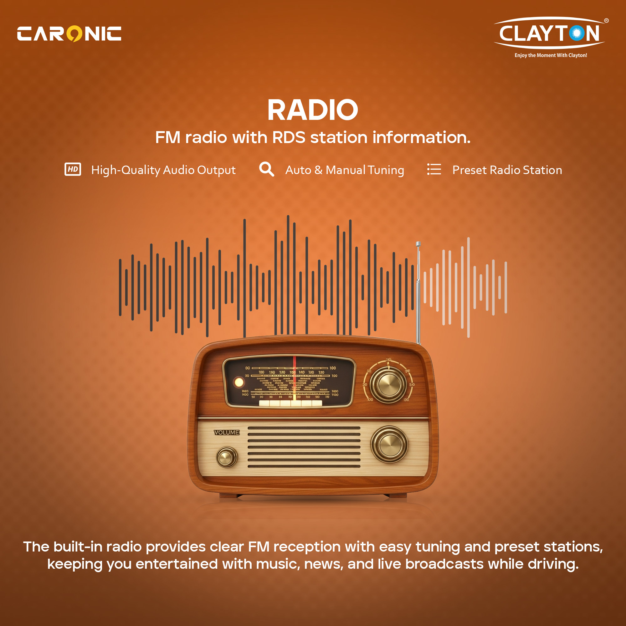 The built-in FM radio delivers clear, high-quality audio with RDS station information for an enhanced listening experience. Featuring auto and manual tuning, along with preset station storage, it makes accessing your favorite music, news, and live broadcasts quick and effortless keeping you informed and entertained on every drive.