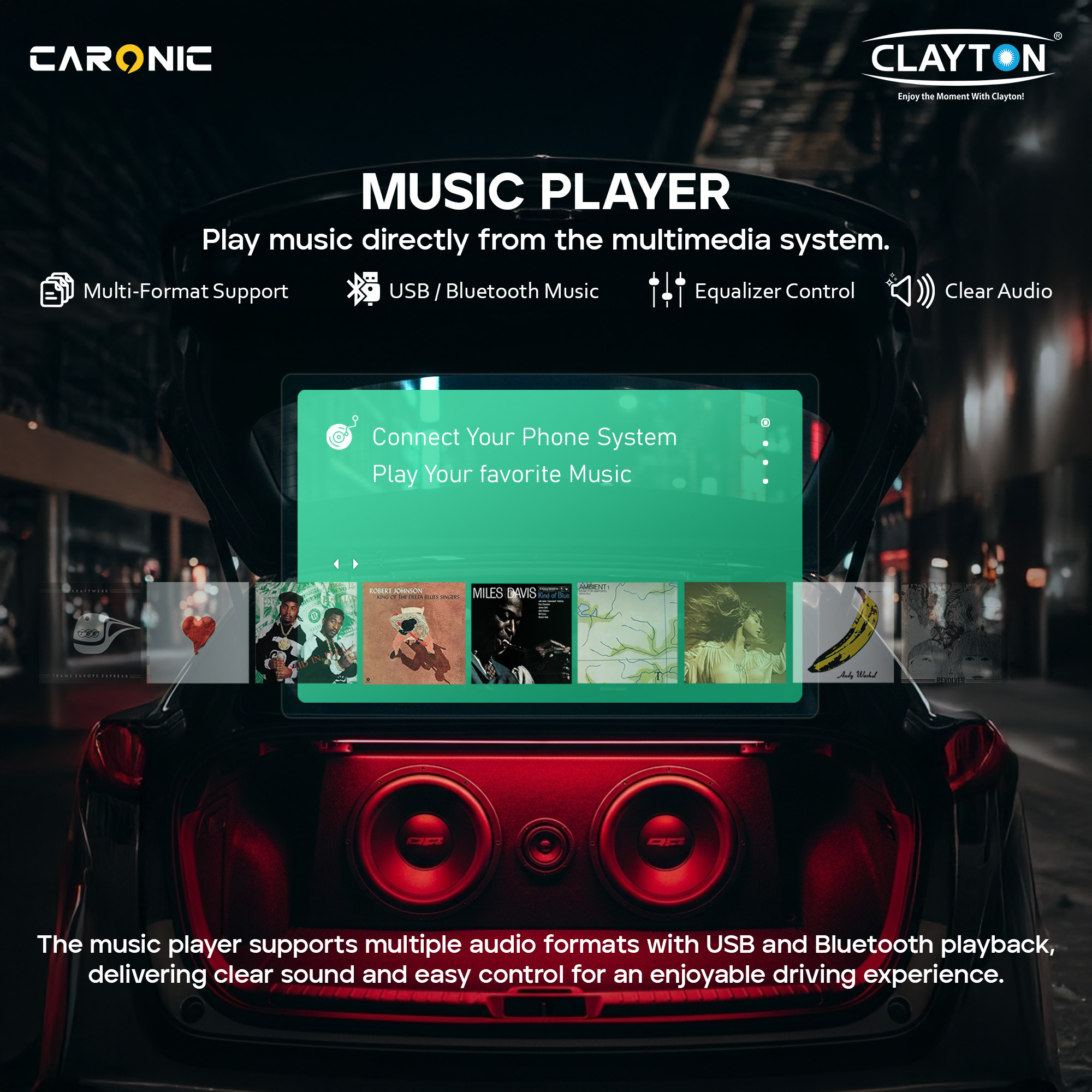 The built-in music player lets you enjoy your favorite tracks directly from the multimedia system with smooth, intuitive control. Supporting multiple audio formats, USB and Bluetooth playback, and adjustable equalizer settings, it delivers clear, balanced sound. Seamlessly connect your phone or external devices to create a personalized listening experience that enhances comfort and enjoyment on every drive.