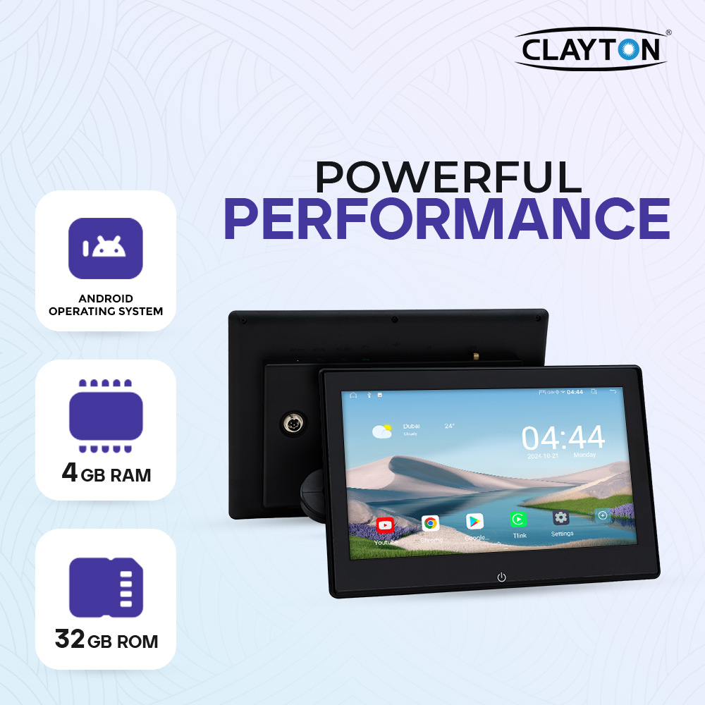 powerful performance with the Clayton Android display, engineered for speed and reliability. Running on Android OS, it features 4GB RAM for smooth multitasking and 32GB ROM to store apps, media, and updates with ease. The sleek, high-resolution screen delivers a responsive, user-friendly experience, making it ideal for infotainment and smart control solutions. Designed for durability, it ensures consistent performance in demanding environments.