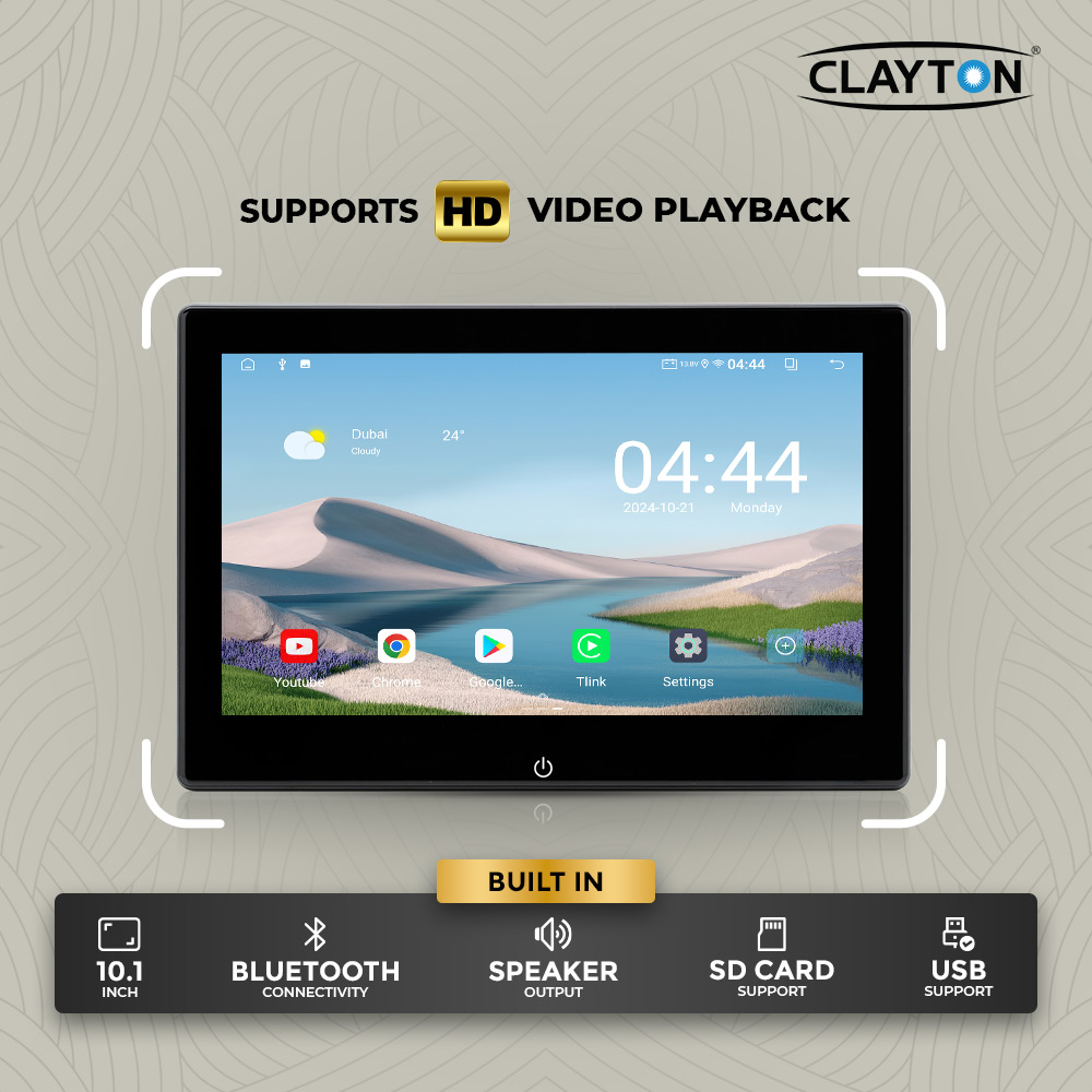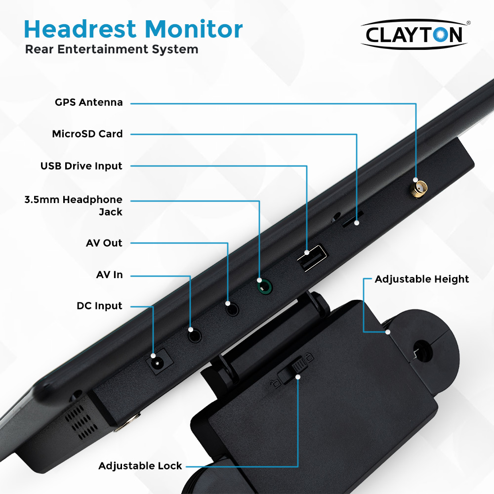 The Clayton Headrest Monitor features a 10.1-inch HD display with built-in speakers, Bluetooth, and Android-powered entertainment. It supports USB and SD cards for easy media playback, offers smooth performance, and a responsive touchscreen. Its adjustable mount fits most vehicles, providing versatile rear-seat entertainment for enjoyable trips.