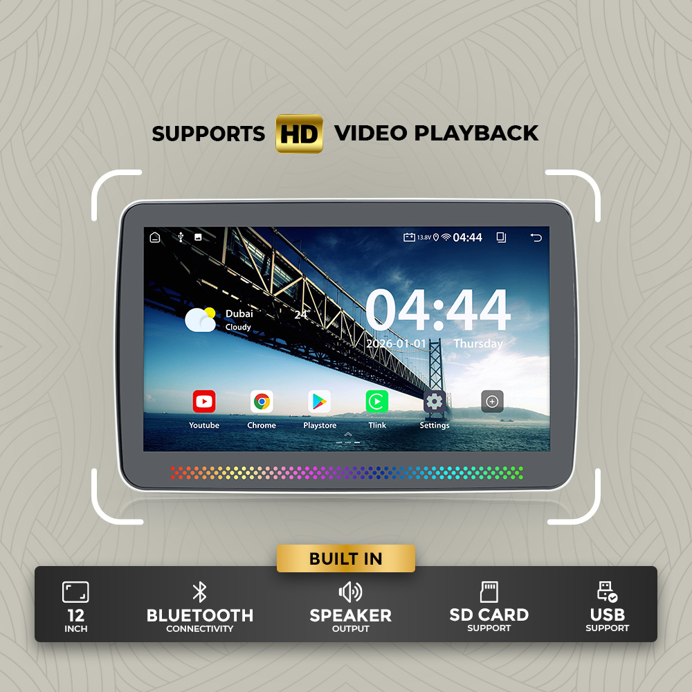Clayton Universal Rear Seat Android Entertainment System features a 12-inch HD touch display with smooth video playback. Built-in Bluetooth, speaker output, USB and SD card support ensure versatile media options. Enjoy apps like YouTube and Play Store via Wi-Fi for endless entertainment. Designed for easy headrest installation, it delivers immersive audio-visual performance, making every journey enjoyable for rear passengers.
