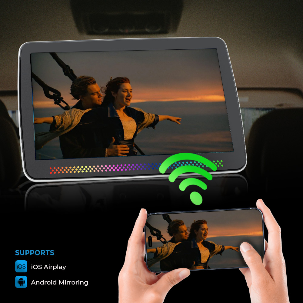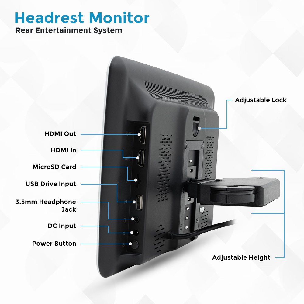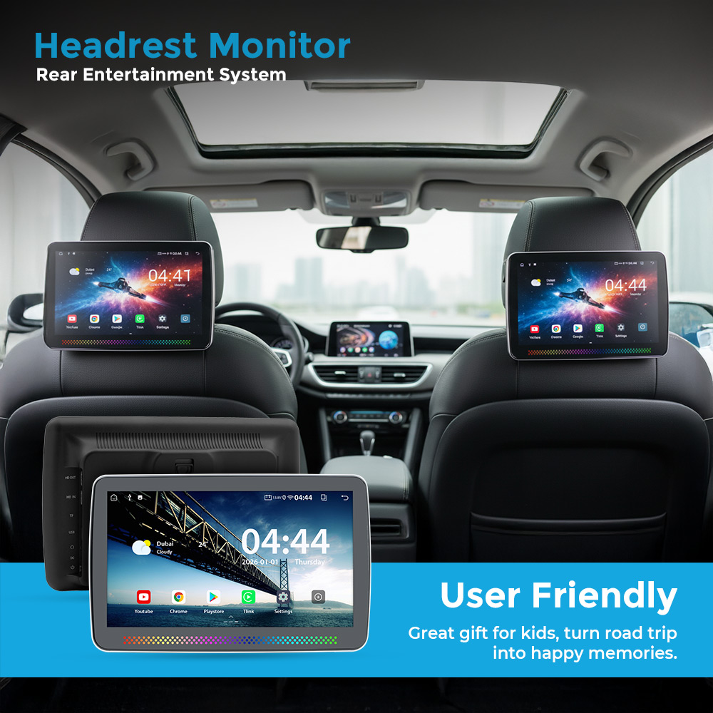 Universal Android Rear Seat Multimedia System features an HD touch display for immersive in-car viewing. Designed as a headrest monitor, it supports Wi-Fi, USB drive input, MicroSD card, HDMI in/out, and 3.5mm headphone jack for versatile multimedia playback. Adjustable height and secure lock ensure easy installation and comfort. Ideal for movies, music, games, and rear passenger entertainment on long drives.