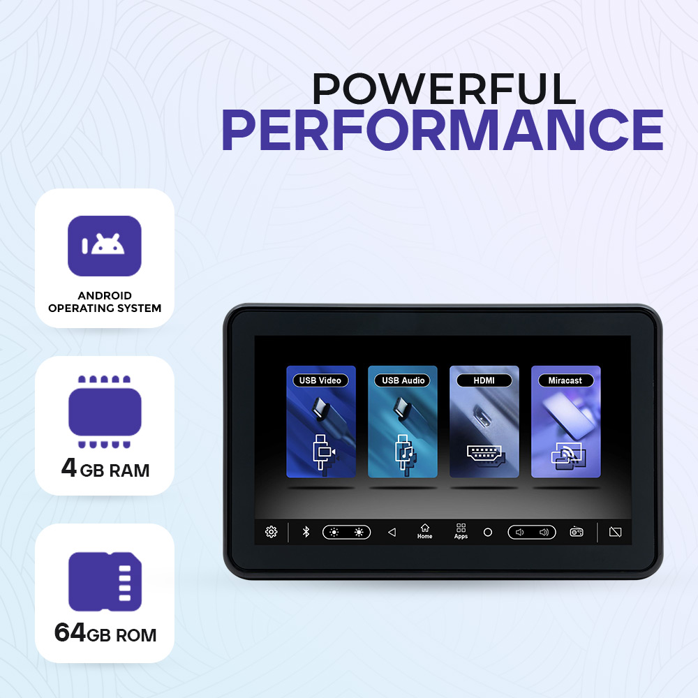 Experience powerful performance with the Clayton Android display, designed for seamless connectivity and smart functionality. Powered by an advanced Android operating system, it features 4GB RAM and 64GB ROM for smooth multitasking and ample storage. Enjoy versatile connectivity with USB video, USB audio, HDMI, and Miracast support. Ideal for entertainment, navigation, and productivity, this display delivers speed, clarity, and reliability in one sleek device.
