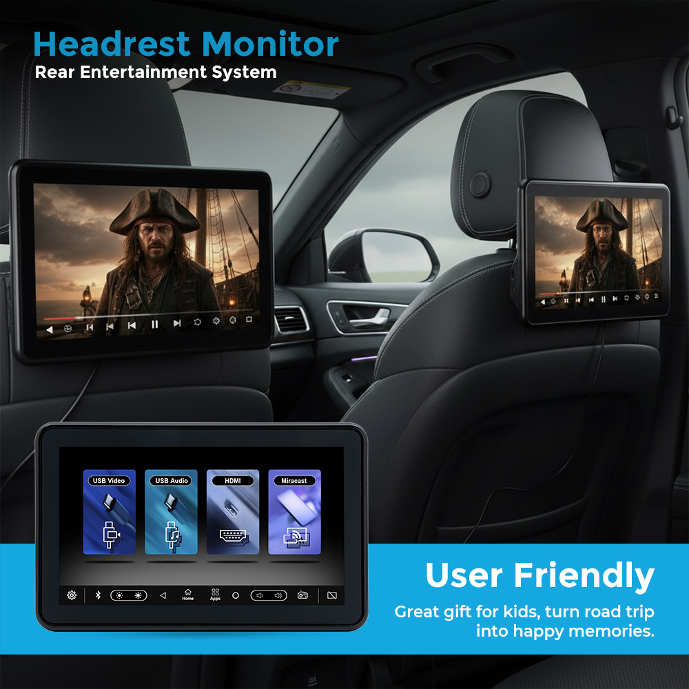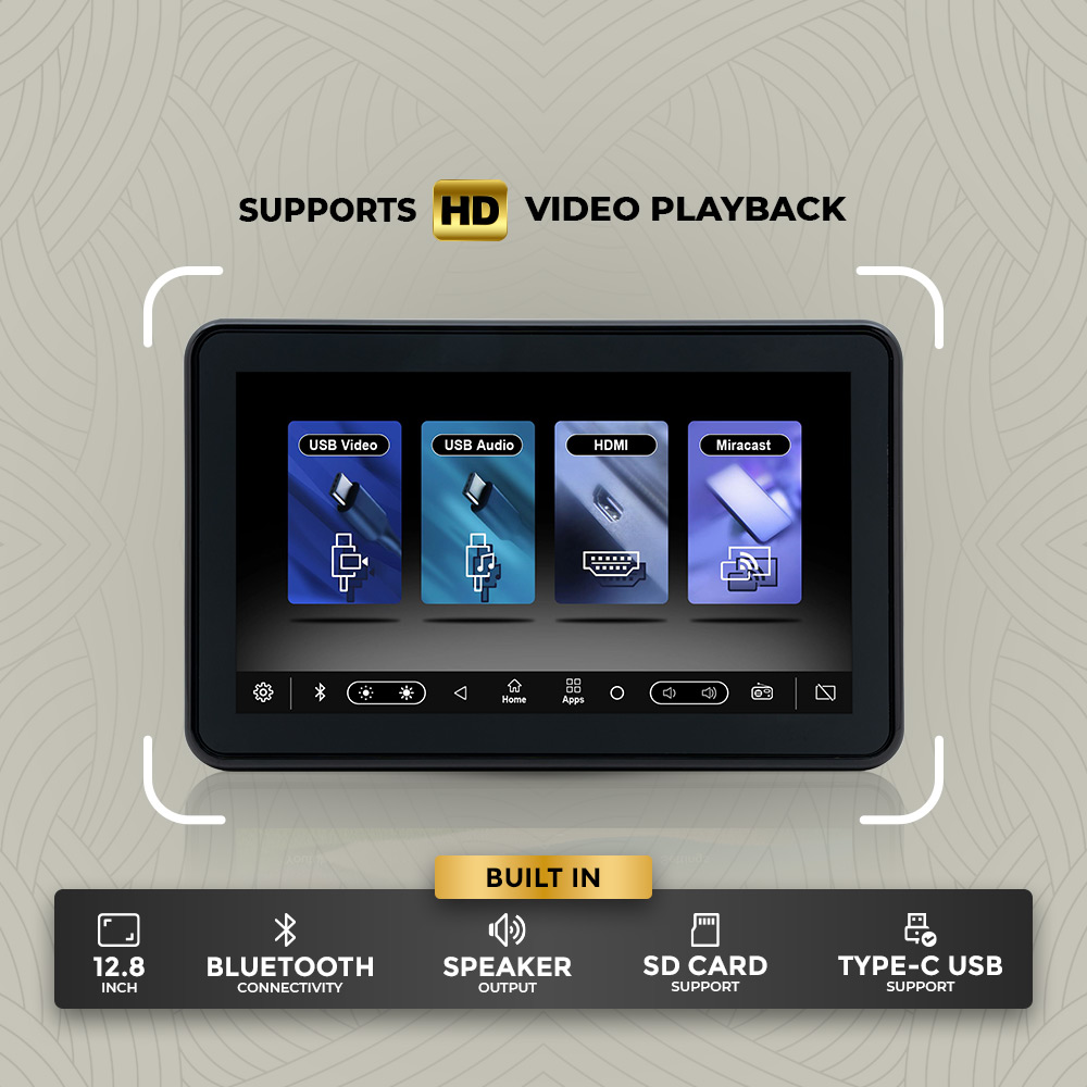 Enjoy premium rear-seat entertainment with the Clayton Headrest Monitor featuring a 12.8-inch HD display for crystal-clear video playback. It supports USB video and audio, HDMI input, and Miracast for seamless screen mirroring. Built-in Bluetooth connectivity, integrated speakers, SD card support, and Type-C USB ensure versatile media options. Designed for comfort and convenience, it delivers immersive viewing and reliable performance on every journey.