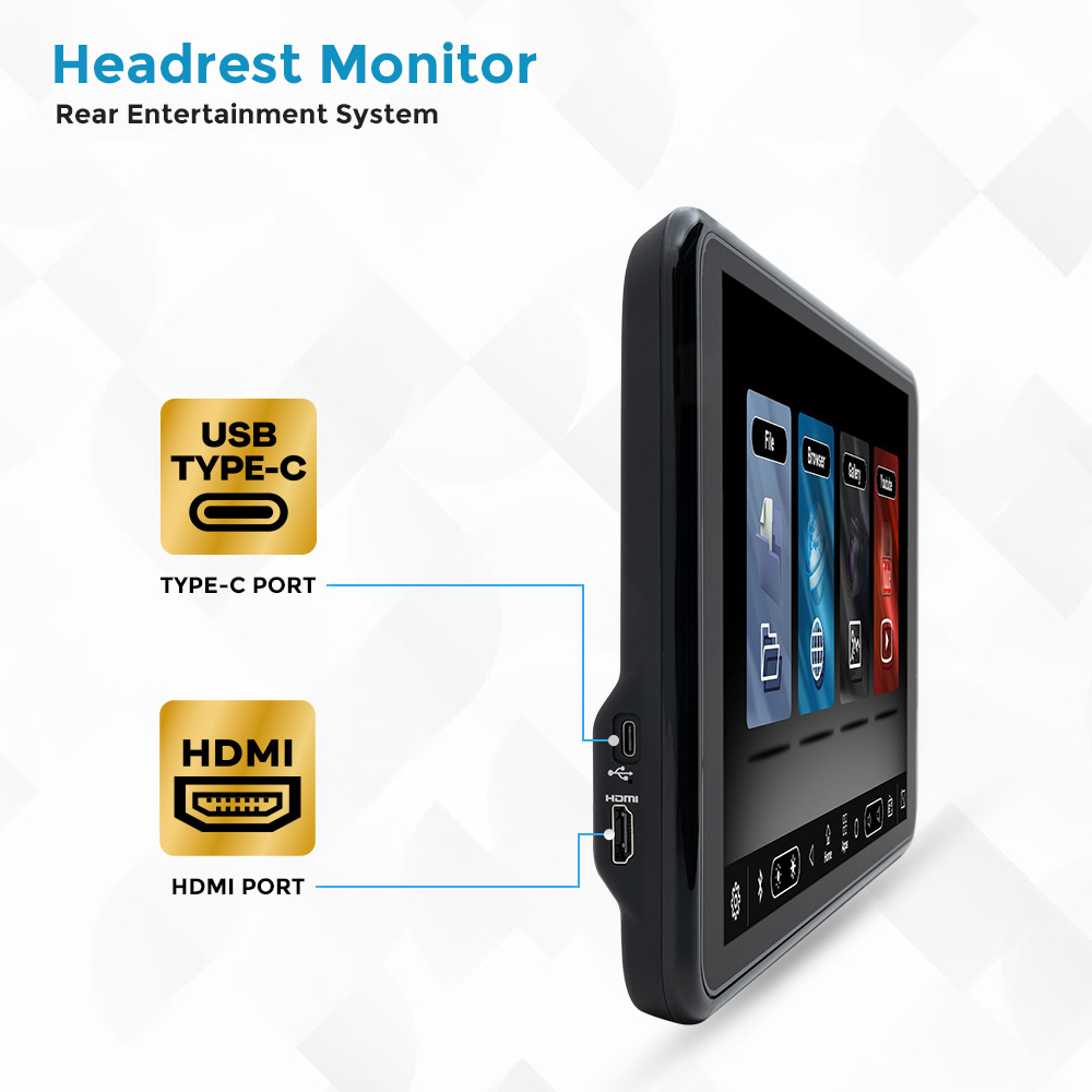 Experience versatile in-car entertainment with the Clayton Headrest Monitor Rear Entertainment System. Featuring USB Type-C and HDMI ports, it supports multiple media sources including smartphones, streaming devices. The high-resolution display delivers crisp visuals, while the slim, modern design blends seamlessly with vehicle interiors. Easy connectivity, reliable performance, and premium build quality make it ideal for long journeys and passenger comfort.