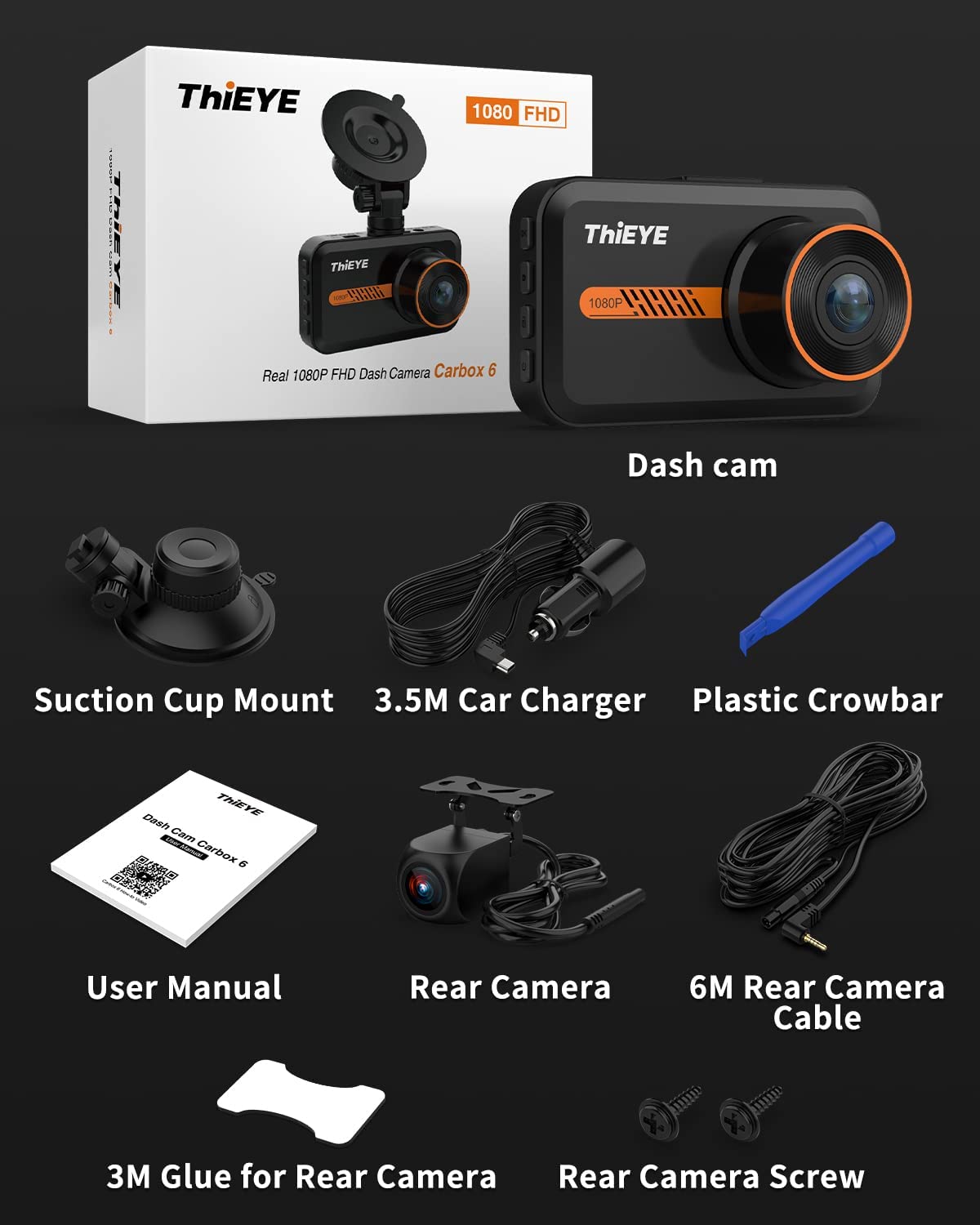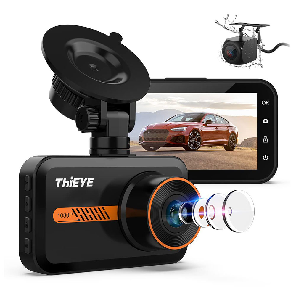 Dash Cam Front and Rear-1080P & 720P: ThiEYE dash cam equipped with 3.2”IPS screen 1080P front Full HD resolution and 720P waterproof rear recording monitor the roads ahead and behind the car simultaneously in super clear definition