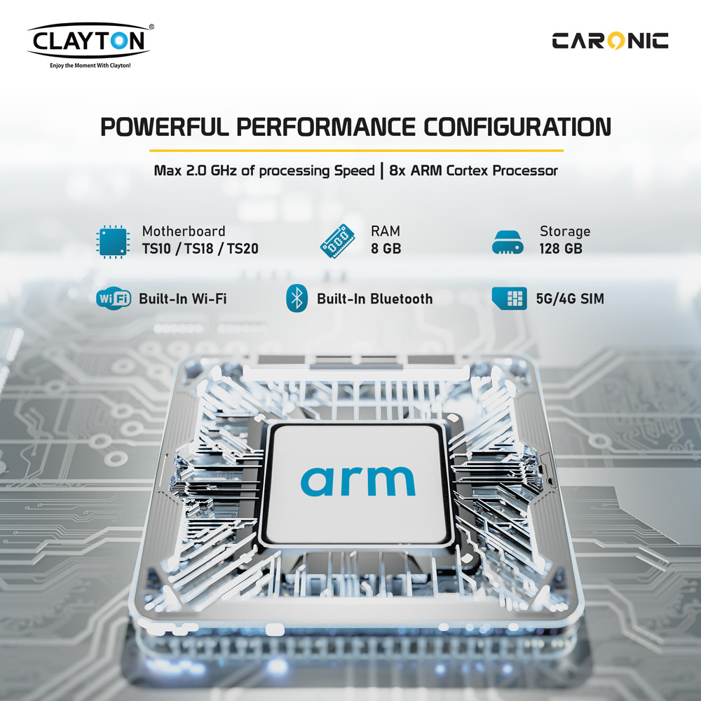 Experience next-level performance with the Clayton Android Multimedia System, powered by an 8x ARM Cortex Processor with speeds up to 2.0 GHz. Designed for versatility, it offers multiple motherboard options (TS10/TS18/TS20), RAM configurations from 8GB, and storage 128GB. Built-in Wi-Fi, Bluetooth, and 5G/4G SIM support ensure seamless connectivity, making it the ultimate smart solution for your vehicle.