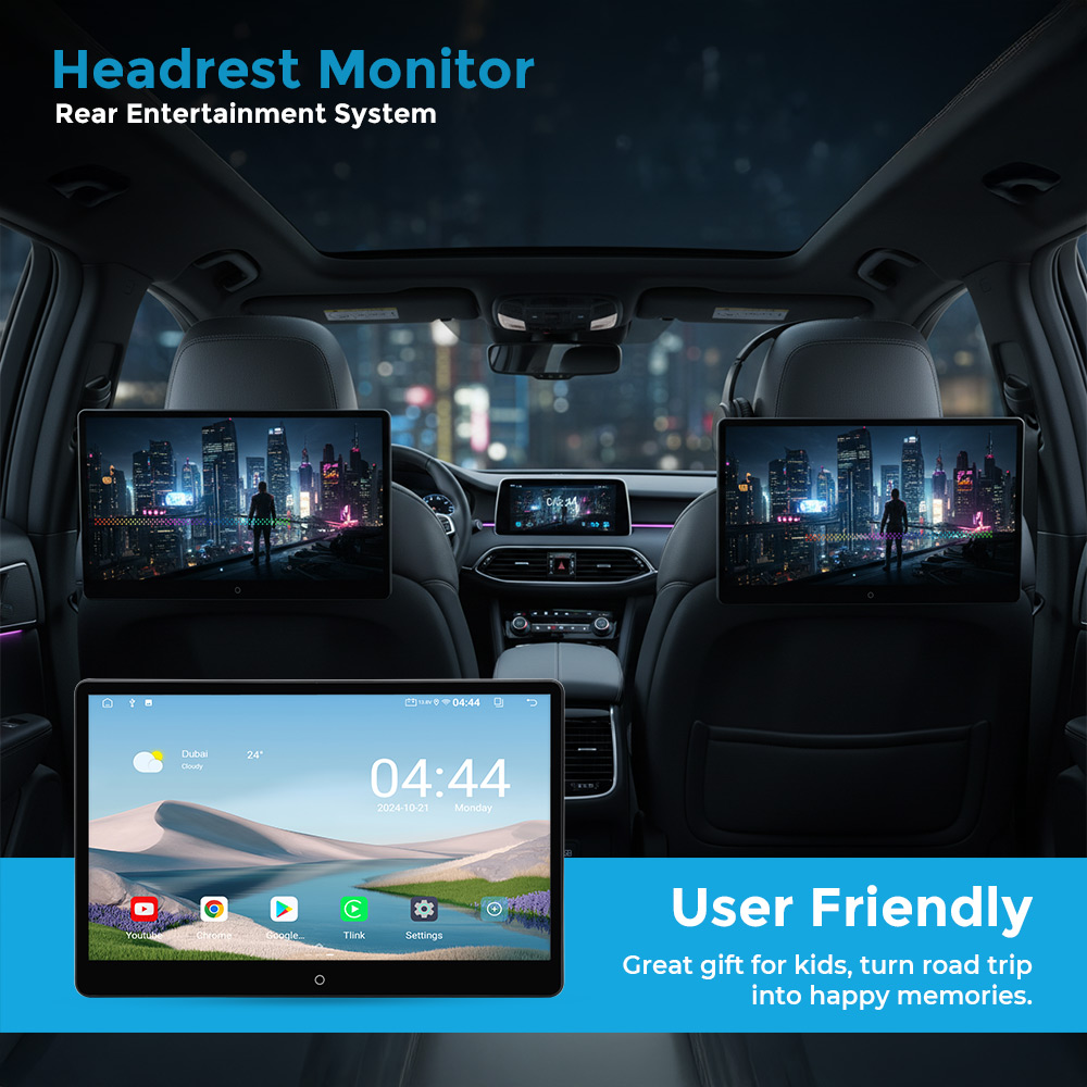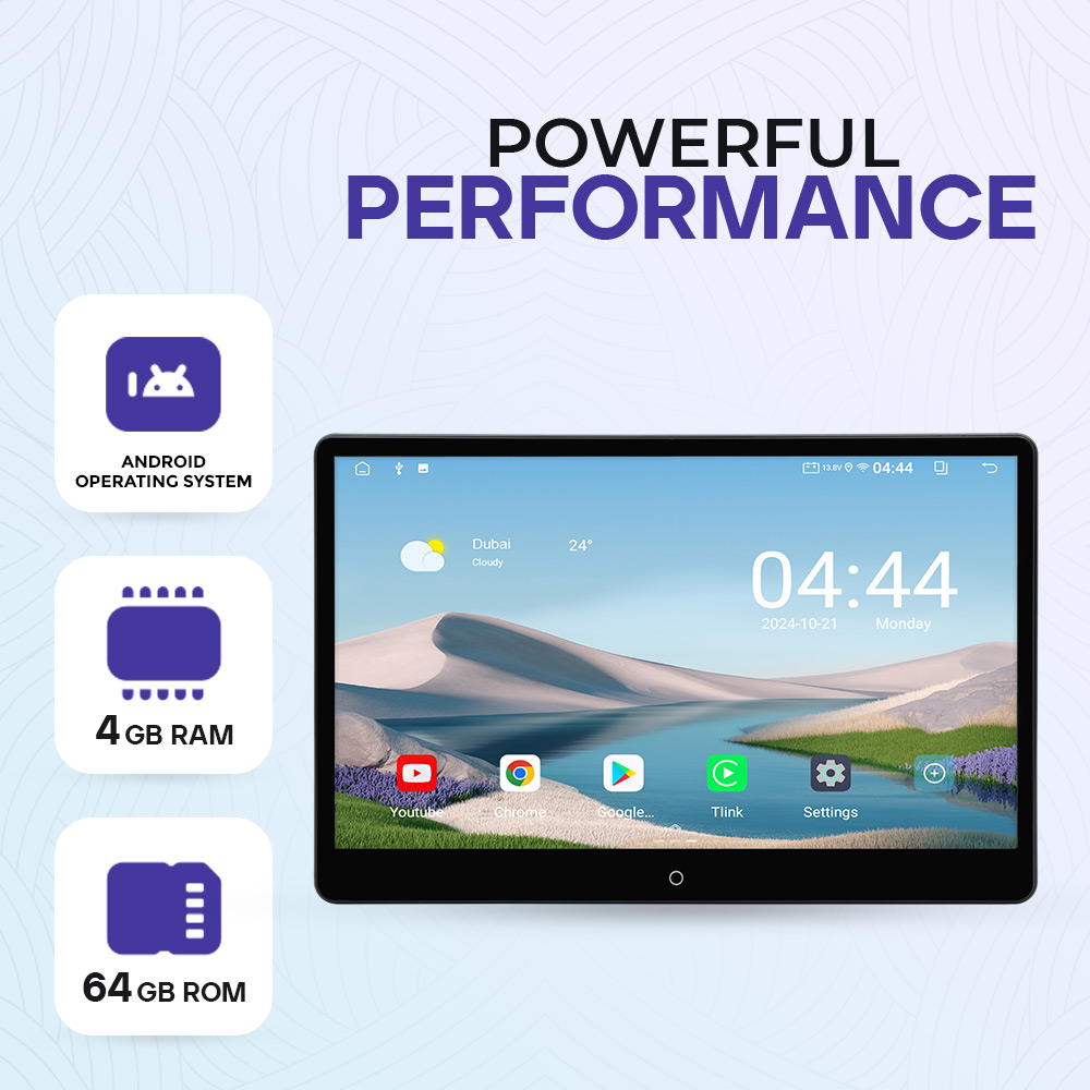 Enjoy powerful performance with the Clayton Android display, built to handle entertainment and multitasking with ease. Running on a smooth Android operating system, it features 4GB RAM for fast, responsive operation and 64GB internal storage for apps, videos, and music. Stream, browse, and download effortlessly while enjoying a seamless user experience, making it the perfect smart display for premium rear-seat entertainment and daily connectivity on the move.