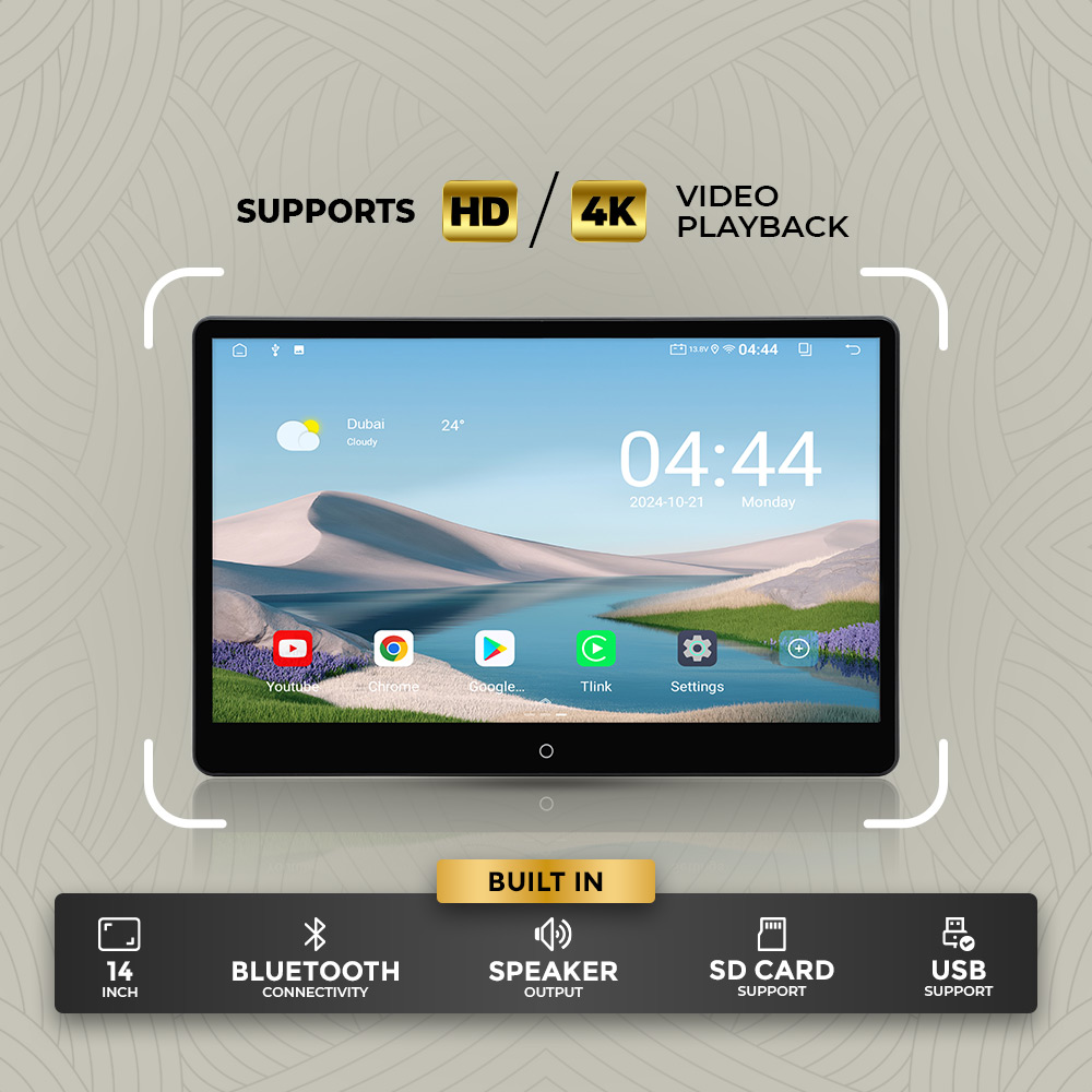 Experience premium entertainment on the go with the Clayton 14-inch HD/4K video playback display. Designed for seamless performance, it delivers stunning visuals and smooth playback. Featuring built-in Bluetooth connectivity, powerful speaker output, USB support, and SD card compatibility, this versatile screen is perfect for movies, music, and streaming. Ideal for rear-seat entertainment, it combines style, clarity, and convenience in one advanced multimedia solution.