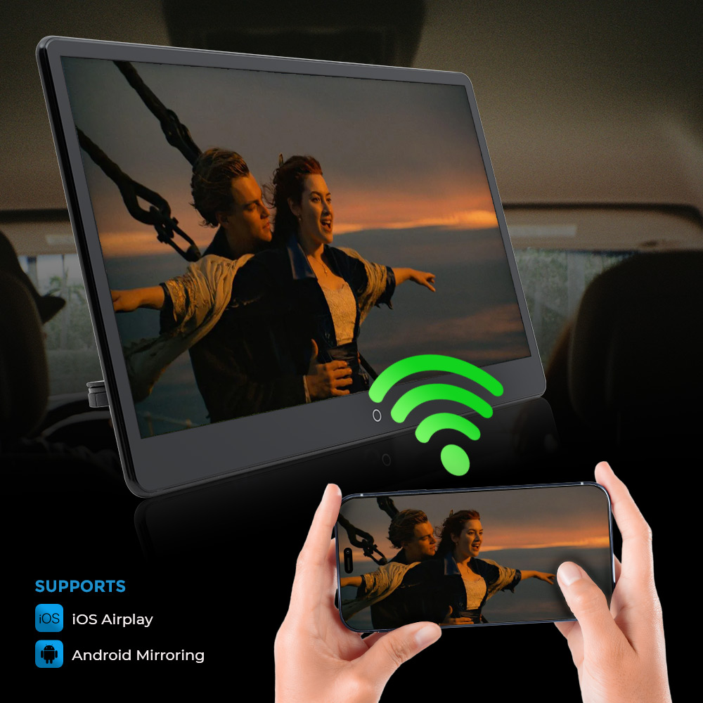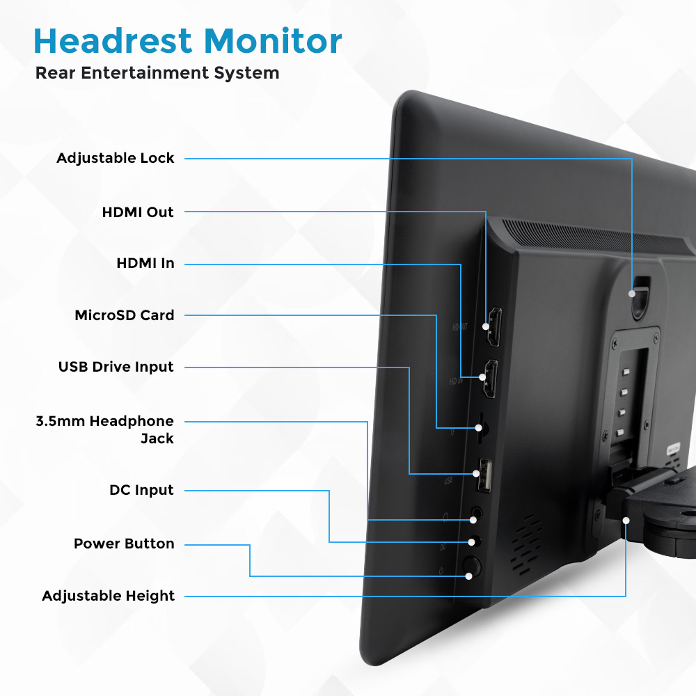 Upgrade Headrest Android Car Rear Seat Entertainment with the Clayton, designed for comfort and connectivity. Featuring HDMI input and output, USB drive and MicroSD support, 3.5mm headphone jack, and DC power input, it delivers versatile media playback. Adjustable height and locking mount ensure a secure fit, while intuitive controls and sleek design provide a premium viewing experience for every passenger on long road trips and daily commutes alike, for families everywhere.