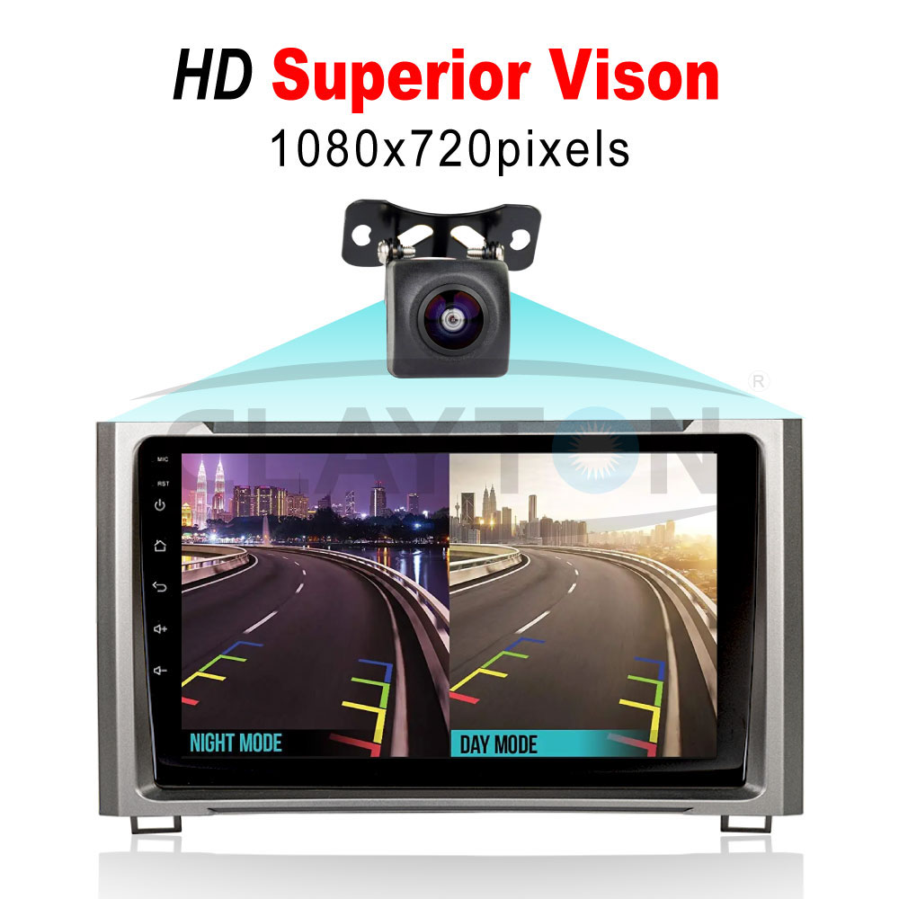 An external camera mounted over the number plate assembly sends an image to the dash-mounted color screen to make parking safer